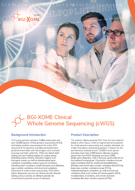BGI-XOME cWGS provides comprehensive and cost-effective detection of point mutations, small indels, CNVs, mitochondrial variations, LOH, translocations, inversions, and dynamic mutations across the entire genome, covering all 3 billion base pairs and over 22,000 protein-coding genes in a single test.